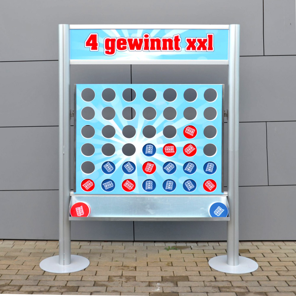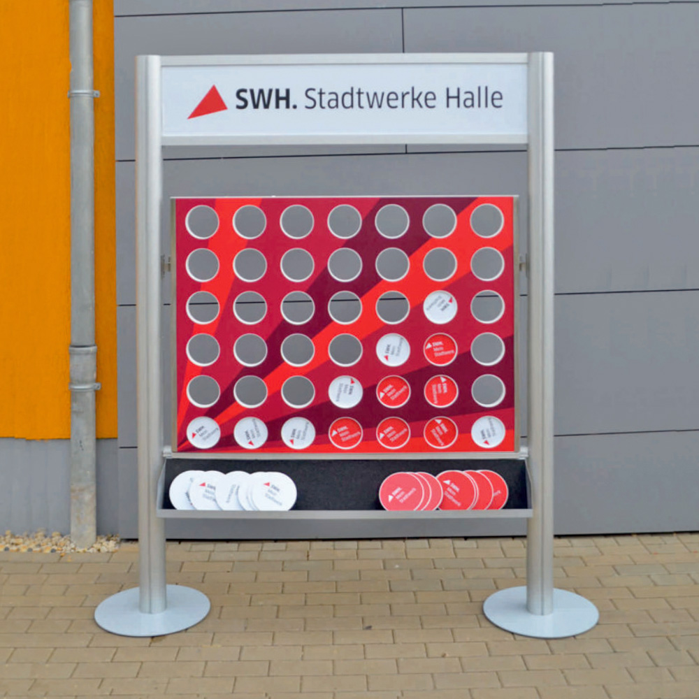 Das klassische Zweipersonen Strategiespiel im hochwertigen XXL-Großformat für Ihre Marketingzwecke. Zwei gegeneinander spielende Teilnehmer, haben das Ziel, je als Erster vier der eigenen Spielscheiben in einer Reihe zu bringen ( horizontal, vertikal oder diagonal). Kommunikationsspiel geeignet für Messen, Tag der offenen Tür und weitere Promotioneinsätze sowie auch Kinderaktionen. Das 4-Gewinnt XXL Modul ist so konzipiert, dass die Teile als Stecksystem innerhalb von ca. 5 Minuten aufgebaut bzw. abgebaut sind. Wir empfehlen dazu ein passendes Transportcase. Die Spielscheiben sind aus Kunststoff und können mit Ihren eigenen Design z. B. Produkte, Logos etc. versehen werden.