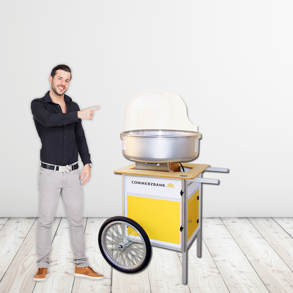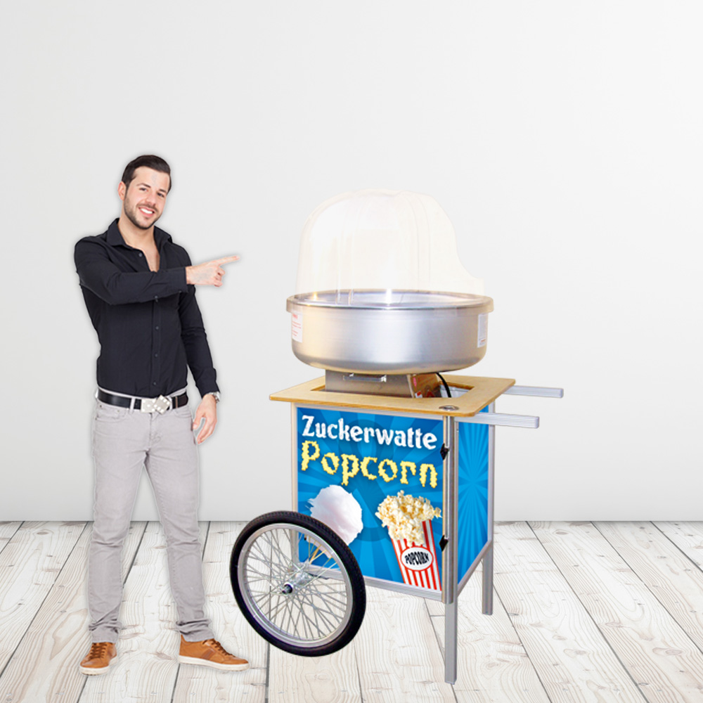 Promotionfahrwagen für Fun Food-Geräte wie Zuckerwatte- oder Popcornmaschinen. Tischplatte aus Mehrschichtholz und 2k-Lack versiegelt. Die Ausführung für Zuckerwattemaschinen besitzt eine Aussparung in der Tischplatte, somit steht die gesamte Zuckerwattemaschine tiefer und man kommt gut an den Wanne zum Herstellen einer Zuckerwatte. Unterbau mit Tür und Magnetverschluss, kann als Stauraum für Zutaten, Werbeprospekte etc. genutzt werden. Individuelles Branding vom kompletten Unterbau möglich.