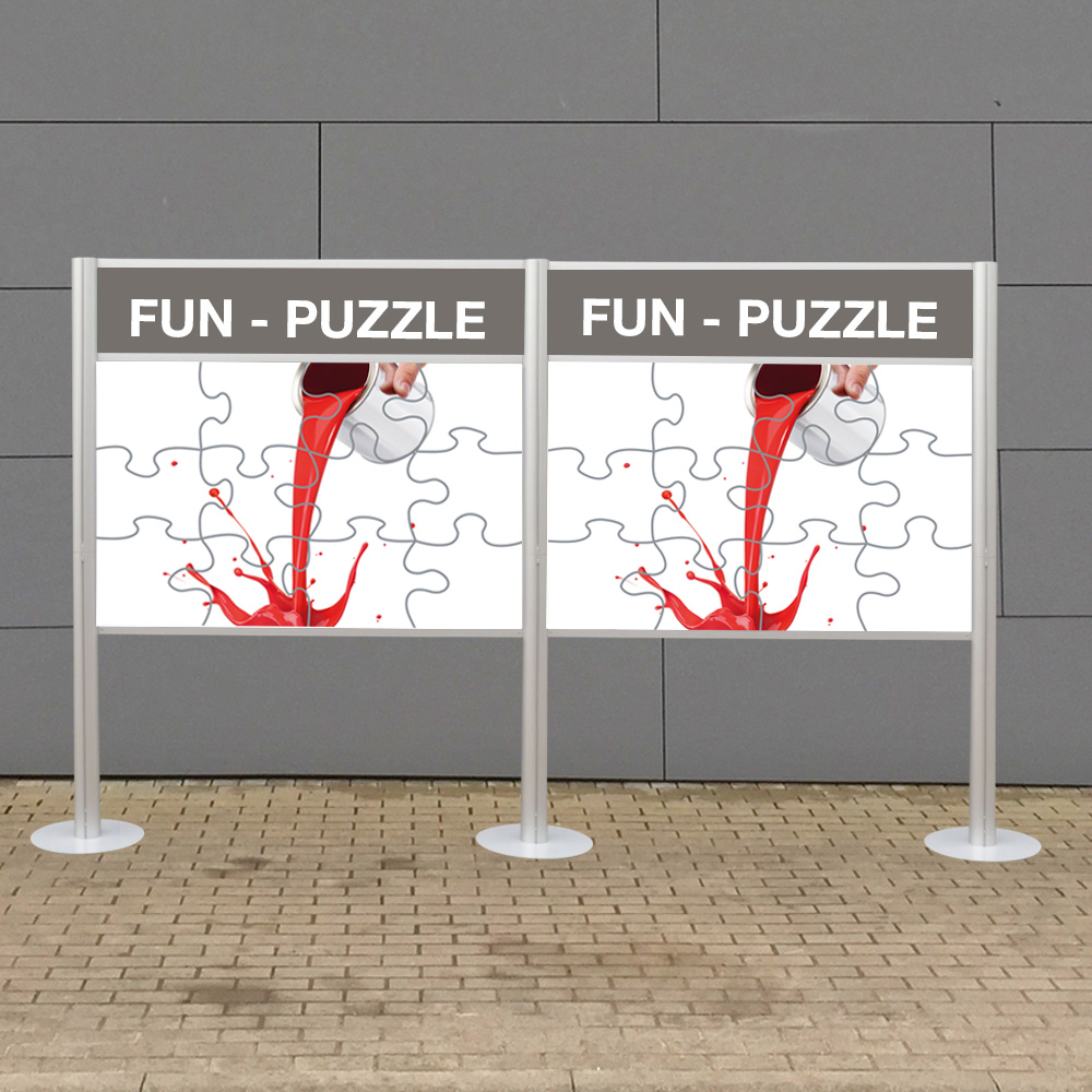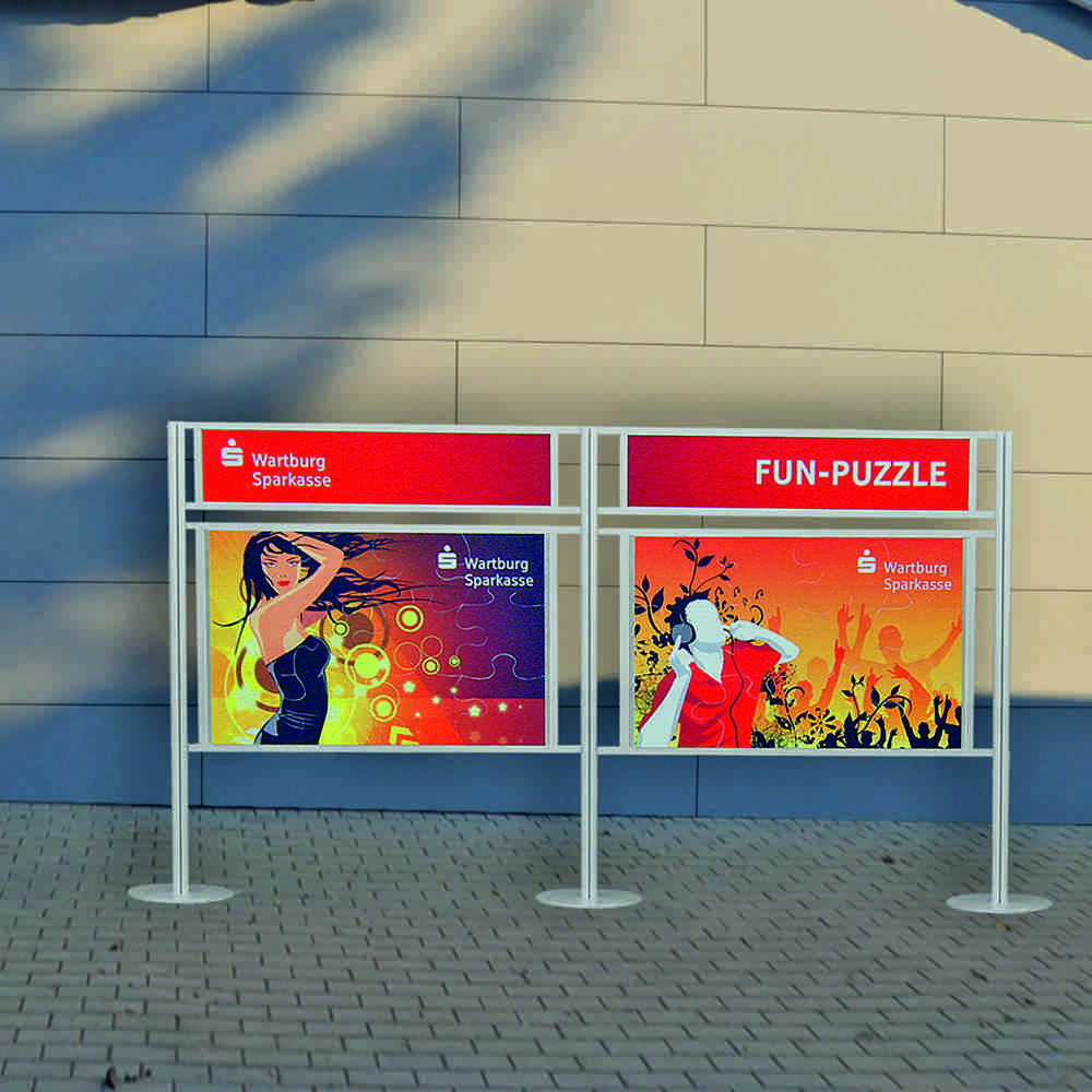 Leicht und schnell zerlegbar für einen platzsparenden Transport. Das Puzzle besteht aus eloxierten Aluminiumprofilen mit verzinkter Blechwand. Die Puzzleteile bestehen aus CNC-gefästen Kunststoffteilen. Das gewünschte Motiv wird mittels schutzkaschierten, digital gedruckten Aufklebern auf die einzelnen Formteile kaschiert. Auf der Rückseite der Puzzleteile befinden sich Magnete zur Fixierung. Es stehen verschiedene Standardmotive zur Auswahl. Ein Motiv ist im Preis enthalten. Die Puzzle-Teile sind 24-teilig für Erwachsene oder 12-teilig für Kinder erhältlich.