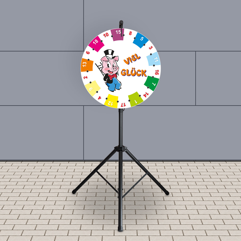 Unser günstiges Einsteigermodell für Tag der offenen Tür, Eröffnungen, Ausstellungen, Kinderaktionen, Veranstaltungen in Schulen und Kindergärten, Messeauftritten u.v.m. Das Glücksrad ist komfortabel in 2 Teile zerlegt und einfach innerhalb 1 Minute auf- bzw. abgebaut. Glücksradscheibe aus 10 mm Kunststoff, cnc-gefräst mit gefaster Kante, weiß inkl. 4C/6C Digitaldruck mit Schutzlaminat; somit ist Ihr Druck wisch– und wasserfest geschützt. Versteckte Befestigung der Glücksradscheibe – keine sichtbare Mittelschraube und somit keine Einschränkungen bei der Gestaltung. Hochwertig gedrehte Stopper aus Stahl, schwarz eloxiert. 3-Bein-Standfuß aus Aluminium, schwarz.