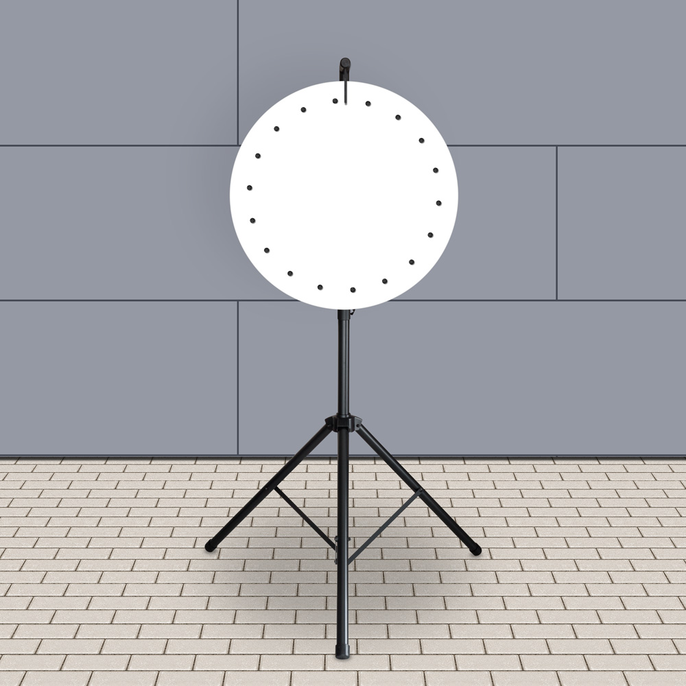 Unser günstiges Einsteigermodell für Tag der offenen Tür, Eröffnungen, Ausstellungen, Kinderaktionen, Veranstaltungen in Schulen und Kindergärten, Messeauftritten u.v.m. Das Glücksrad ist komfortabel in 2 Teile zerlegt und einfach innerhalb 1 Minute auf- bzw. abgebaut. Glücksradscheibe aus 10 mm Kunststoff, cnc-gefräst mit gefaster Kante, weiß. Versteckte Befestigung der Glücksradscheibe – keine sichtbare Mittelschraube und somit keine Einschränkungen bei der Gestaltung. Hochwertig gedrehte Stopper aus Stahl, schwarz eloxiert. 3-Bein-Standfuß aus Aluminium, schwarz.