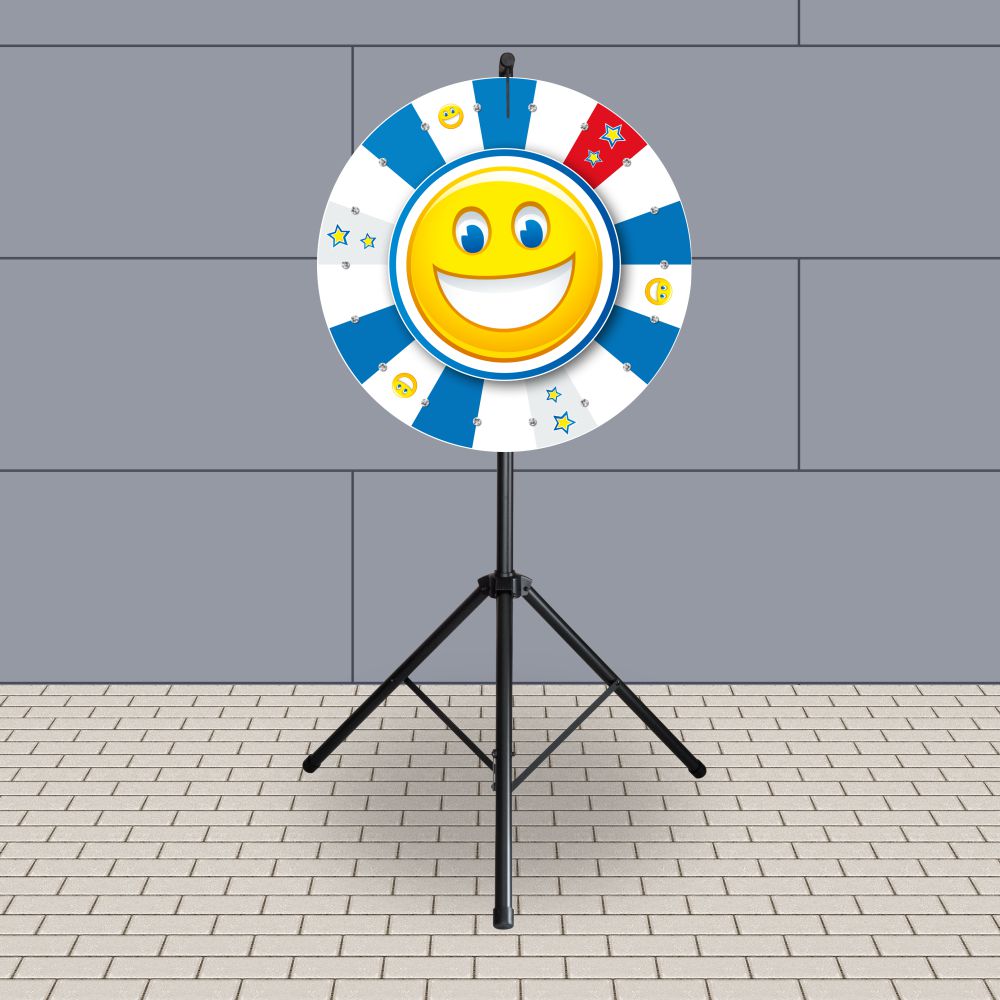 Die Glücksradscheiben (vordere, feststehende Scheibe 56cm, hintere, drehende Scheibe 90cm) bestehen aus Kunststoff, cnc-gefräst mit gefaster Kante inkl. 4C/6C Digitaldruck mit kratzfesten Schutzlaminat; somit ist Ihr Druck wisch– und wasserfest geschützt. Zwei wartungsfreie Hochleistungslager sorgen für einen sauberen Lauf der Glücksradscheibe. Hochwertig gedrehte Edelstahlstopper - neutraler Farbton passt sich jedem Layout an (kein Korrodieren oder Abbrechen). Das komplette Glücksrad ist für den Innen- und Außenbereich entwickelt, es wird kein Holz etc. verwendet, dadurch auch bei Regen und Outdoor einsetzbar! Innerhalb kürzester Zeit in 2 Teile zerlegt und verstaut bzw. ebenso schnell aufgebaut. Die Standsicherheit erhält das Glücksrad durch den mitgelieferten 3-Bein-Standfuß aus Aluminium.