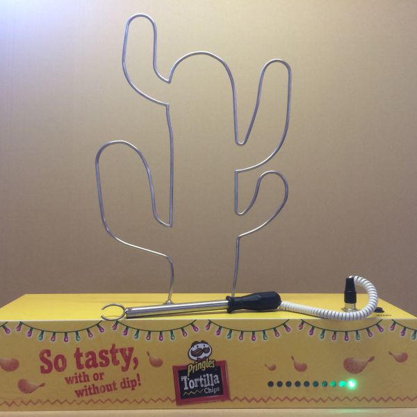 Der Unterbau des Heißen Drahtes besteht aus weißen Acrylglas, welches auf Gehrung gesägt und sauber verklebt ist. Der "Heiße Draht" wird aus Edelstahl in unserer Standardform gebogen bzw. auf Gehrung geschnitten und verschweißt. Der Heiße Draht kann im Standarddesign oder im Kundendesign mittels 4C/6C digitalgedruckten Aufklebern und Schutzkaschierung gebrandet werden.