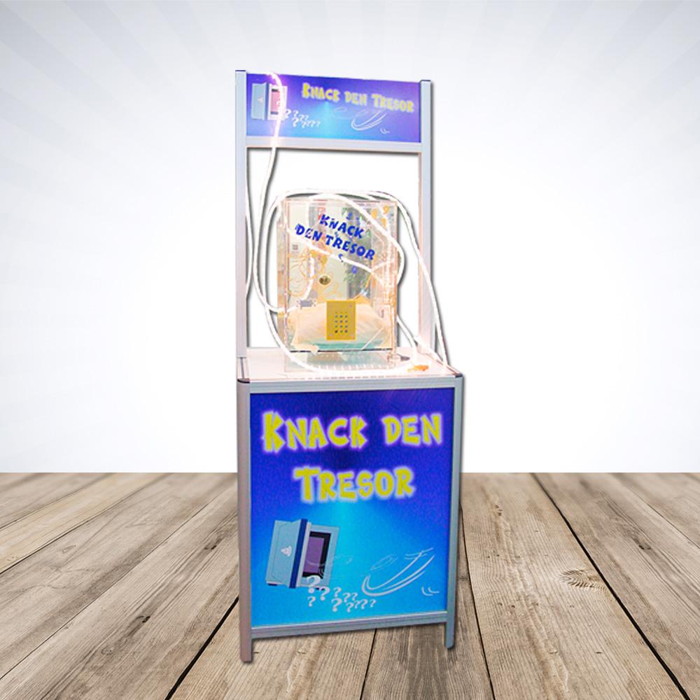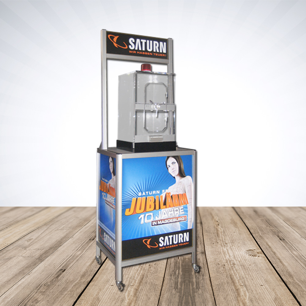 Hochwertiger und stabiler Promoterstand für unsere Tresorgewinnspiele. Rahmengestell aus eloxierten Aluminiumprofilen als Füllung verwenden wir weißen Kunststoff inkl. Transportrollen. Der Tresorstand bietet Platz für unseren Standarddigitaldruck oder kann natürlich auch in Ihrem Design gestaltet werden. Das Topschild ist abnehmbar.