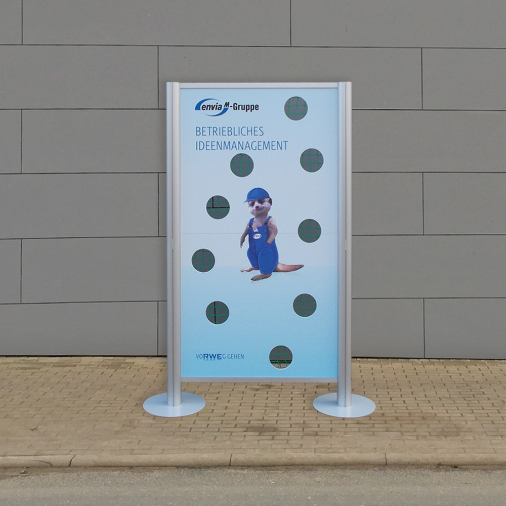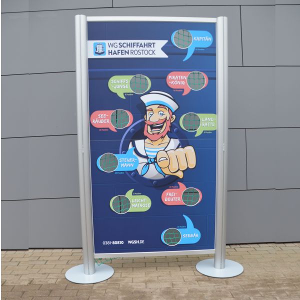 Das massiv-standfeste jedoch leicht zu transportierende Grundgestell wird aus eloxierten Aluminiumprofilen hergestellt. Der Druck der Front erfolgt im 4C/6C-Digitaldruck-Verfahren mit Schutzkaschierung für einen dauerhaften Halt Ihrer Werbung. Für den Transport wird das Wurfspiel mittels Stecksystem in wenige Teile demontiert, somit ist es für jedes Personal gut in der Handhabung.